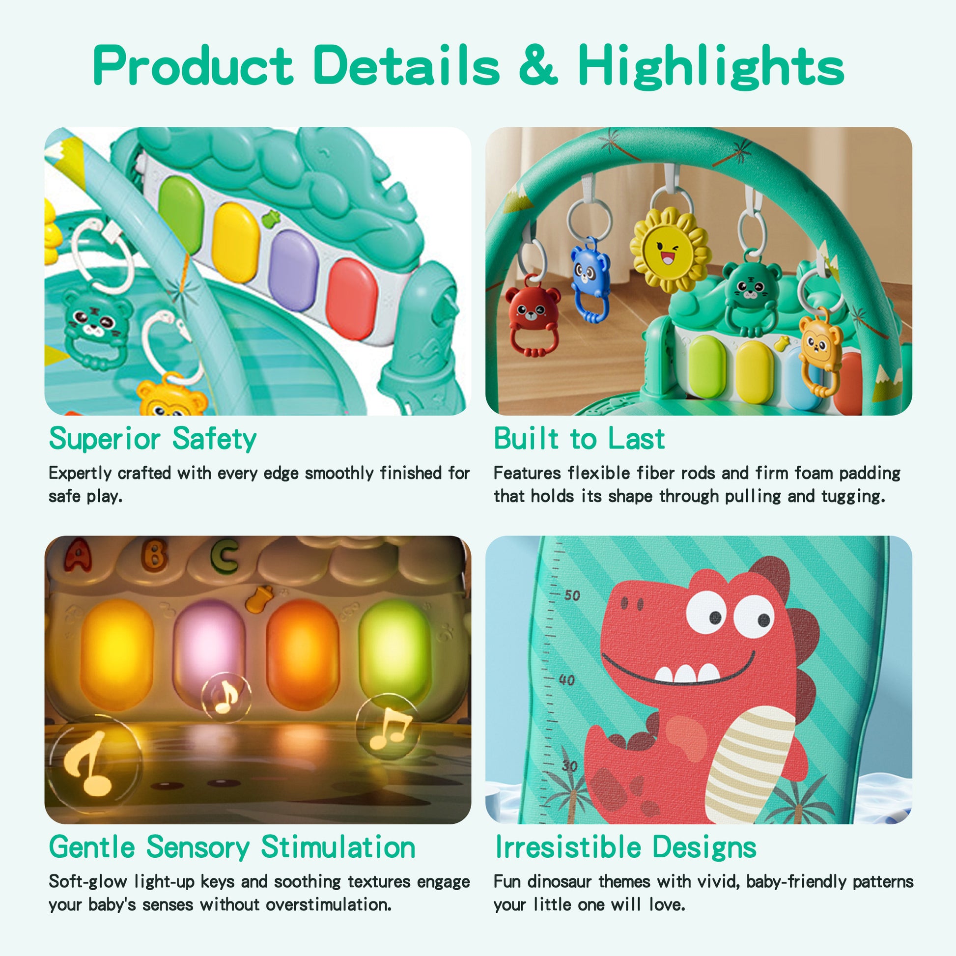 - Interactive Piano Mat: A kick-activated piano with lights and music stimulates your baby's auditory and visual development. This multi-sensory toy is perfect for newborns to 12 month